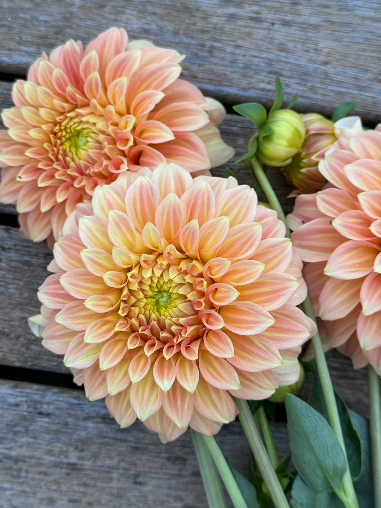 This beauty is a miniature decorative dahlia. She has beautiful pale yellow, peach and golden tones. The tones vary over the season. A tall plant, great for picking.